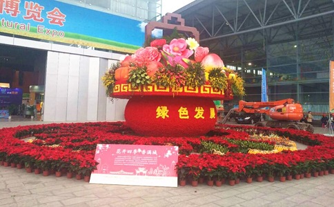 設(shè)計說明:中國文化元素創(chuàng)意花藍景觀 , 高7.5米 , 寬30米, 鮮花3萬只, 防真花水果雕刻43件, 盆栽花2000盆,制作周期15天。