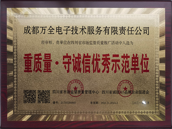 熱烈慶祝成都萬(wàn)全電子榮獲"重質(zhì)量·守誠(chéng)信優(yōu)秀示范單位"稱(chēng)號(hào)